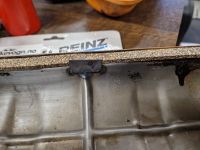 Vel hjemme, ser han at korkpakningen er sugd litt inn i nedkant av dekselet, så dat fant vi fram gamle kustom-triks, og han laget og svesiet på en liten tab for å hold pakningen på plass: