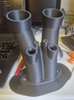 OK, her har det ikke vært så mange oppdateringer de siste par ukene, men sånn er det når man ikke bare skal designe og bygge deler til en motor, men man samtidig bygger og oppgraderer maskinen som skal lage delene... Det dreier seg selvsagt om en 3d-printer, og vi har en printer som har byggevolum på 350x350x350 mm og den har fungert bra i lang tid, men vi begynte å få problemer med at ledningene som går inne i kabelgater begynte å få brudd, så da tenkte vi det var lurt å bygge om til CAN-buss styring av det som foregår på verktøyhodet, og det var ikke bare-bare.... Men etter noen uker med banning over linux og annen sort magi, fikk Atle dette i gang, og vi kunne begynne å sette opp printeren til å printe i det aktuelle materialet. Planen var å printe innsuga i karbonforsterket nylon, og det er et ganske kilent materiale å få til. Både fordi det ikke sitter så godt fast i byggepplata, og fordi det har en tendens til å "warpe" når det kjøles ned. Så det ble et par runder med resultater som dette: