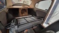 Ryggen på plass. Hattehylla kjøpte jeg for 8-10 år siden, samme med basskassa. Om den blir med i stereoplanene vet jeg ikke, får se. Har lagt teppene på hjulhusene løst. Disse skal limes etterhvert. Som nevnt tidligere så er dette et av de billigste teppesettene fra TMI, og akkurat her er passformen så som så. Kan vel mulig strekkes en smule.