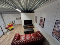 Innredet mesanin med sofa, TV og div. Kommer bad/WC og minikjøkken etterhvert.