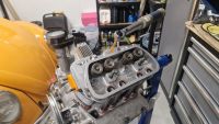 Monterte sylinder 1 med shimsen på 0,75 som var der fra før for å stake ut vendehøyden. Målte 1,7, som er for høyt. Målet er ca 9 i kompresjon, som Jørn Tangen målte med 1,4 i vendehøyde. Jeg har lavkompresjonsstempler som etter det jeg finner av info har 7,2:1 (mulig lavere)  mot 7,5:1 på standardmotorer, rett satt opp. Havnet derfor på å bestille 0,25 shims fra hotshop. Montert på kommer jeg frem til en vendehøyde på 1,2-1,3, som gir meg ca 8,8, give or take.