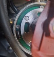 Alt gikk greit (begynner å få rutine på å bytte gassere/innsug), og etter en drøy time var jeg klar for prøvetur. Smooth og fin, men 150m borti veien hørte jeg en begynnede rasling, og jeg stoppet og sjekket at ikke noe hadde ramla inn i vifta. Alt så bra ut så jeg fikk den hjem, og tok av viftereima for å sjekke om det kom fra vifte/dynamo, men neida: