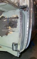 Hjulhus, høyre foran. Her hadde det vært gjort en reparasjon fra før - så både jekkfeste og litt av avstiver samt nedre del av veggen ble skjært bort. Noe småplukk blir laget for hånd