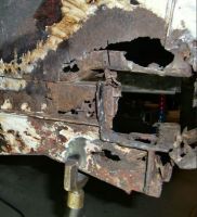 Hjulhus, høyre foran. Her hadde det vært gjort en reparasjon fra før - så både jekkfeste og litt av avstiver samt nedre del av veggen ble skjært bort. Noe småplukk blir laget for hånd