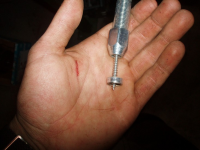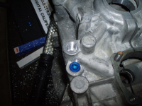På toppen av blokka er ein an 3/8" plugg. Men denne er litt spesiell sidan du ikkje kan gjenga pluggen heilt ned. Det er nemlig ikkje nok materiale i blokka. Pluggen var 10mm og det er 8mm ned til den langsgåande kanalen i blokka. ergo so må pluggen gjengast til den stikk ca 2mm over blokka..