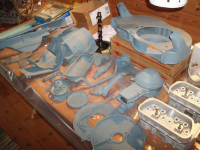 Her e eit utvalg lause deler som har tørka ferdigt etter å ha hatt seg ein runde i delevaskaren. Varmepottena skal mattast ned og lakkast i varmebestandig lakk. Støtstangrøra skal strekkast ut("fjører" i endane som må vera ute ved topp montering) so skal dei som sprikker kasserast(allerede eit røyr med lekkasje..) og so skal dei sandblåsast ilag med resten av blekka.