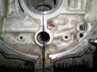 Her er alle 3stk 3/8" pluggane gjenga opp på framsido. Noter att det er 2 plugger igjen. den vetle midt i bildet er ein spesialplugg som skal stenge for oljetilførslen inni kanalen, og den bør IKKJE nappast ut, med mindre du lagar deg ein spesial npt plugg å stappa inn etterpå, for vanlig funkar ikkje. Pluggen nedi hjørna er ikkje noko oljekanal trur eg. for der ville det normalt vera gjenga opp for festing av motorbjelke på T2 blokk. men mulig det er ein oljekanal på T1 blokk ? nokon som veit?