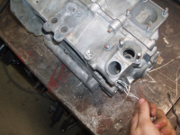 Rensing av oljekanalane sheep 'O metoden. Brukte ein 5 mm wire som eg flisa opp så han delte seg so berre pjåta inn so mangen wire delar som det er plass til, samt flisa opp enden. Då har du ein innvendig stålbørste med litt rotering og attogfram..